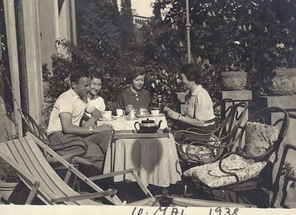 Figure 23a. My father seated at an outdoor table in front of the Villa Primavera in May 1938 with his sister (opposite him) and two of his cousins; note the vertical pole behind his sister’s head