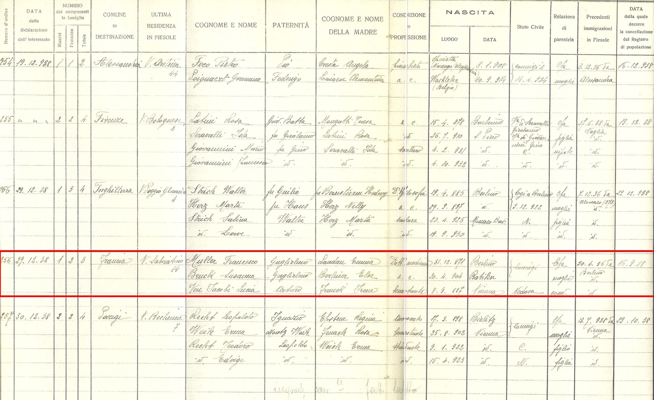 Surviving historic records archived at the “Archivio Storico Comunale,” the “Municipal Historic Archive,” in Fiesole, place my aunt Susanne and my uncle Dr. Franz Müller’s arrival there in about March 1936, and their departure in mid-September 1938.  Beginning approximately a year after their arrival, that’s to say, in March 1937, and continuing until they left for France in mid-September 1938, registration logs from the Villa Primavera record numerous guests.  I was surprised at the large number of visitors who stayed there, mostly Jewish, and just assumed my aunt and uncle hosted them as they tried to escape Europe and Nazi persecution.  While I eventually came across a reference indicating my aunt and Ms. Jacobi had run the Villa Primavera as a bed-and-breakfast, explaining the multiple boarders, this did not initially alter my view that the Jewish guests had already permanently fled Germany, Austria, Belgium, and Switzerland, never to return.