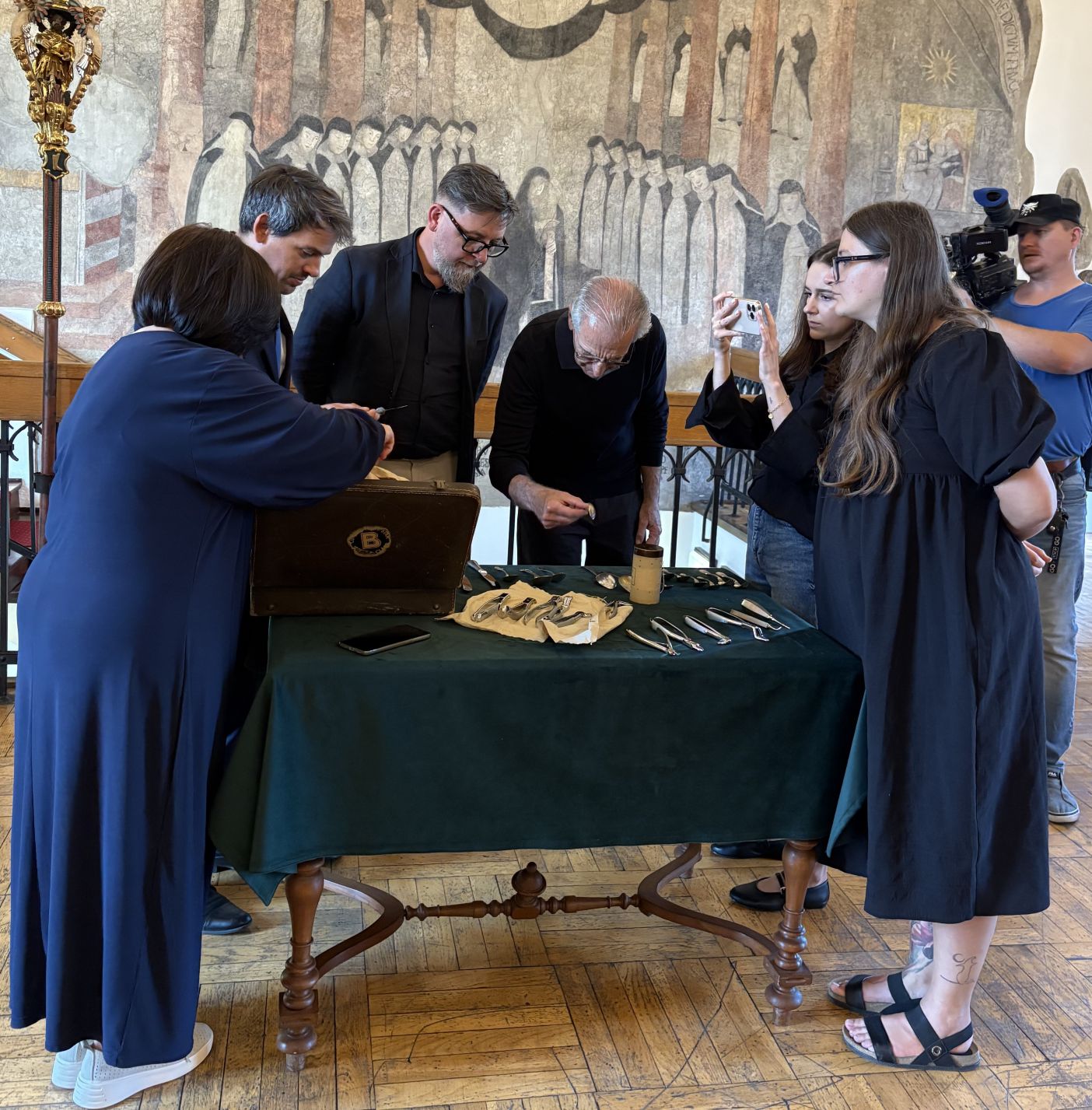 Notwithstanding the pace of our vacation, I had two primary aims during this trip. The first was to revisit the town where my father, Dr. Otto Bruck, was born in 1907, Ratibor, Germany [Racibórz, Poland]. As I’ve frequently discussed, my family owned a hotel restaurant in the town from ca. 1850 to 1925 known as the Bruck’s “Prinz von Preußen” Hotel. The hotel survived the Second World War intact save for the burned roof, but sadly following their rise to power the Communist authorities dismantled the establishment to “harvest” bricks to rebuild Warsaw. I have old cutlery monogrammed with the three generations of my Bruck family that owned the hotel and decided to donate them to the local museum. I also bequeathed a small briefcase of my father’s surviving dental tools. (Figure 2) While my father never practiced dentistry in his birthplace, coincidentally, the Muzeum w Raciborzu has an entire floor of its exhibit space devoted to old dental machines and equipment so donating my father’s dental instruments there made sense.